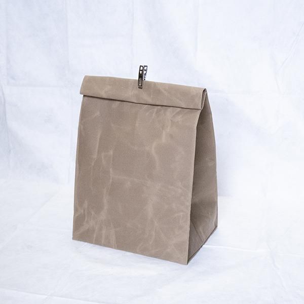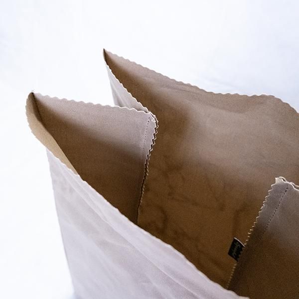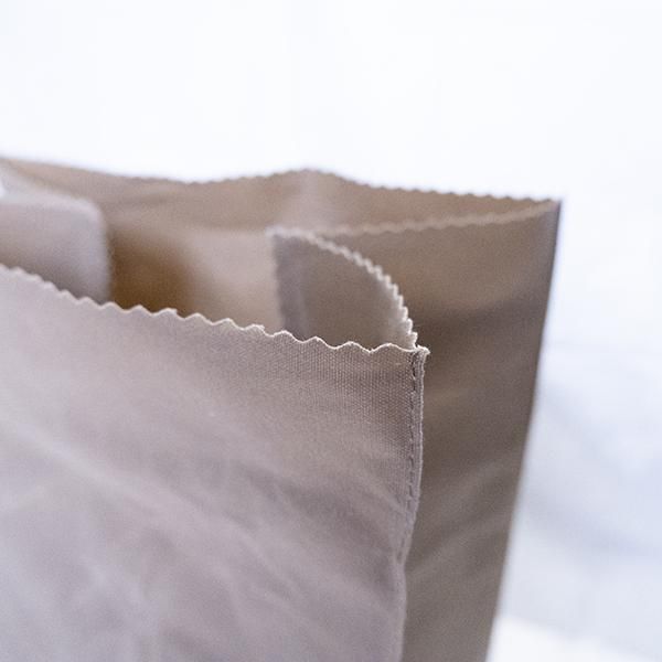 ほつれ止めのために生地の裁断面は、折り伏せるかパイピングをするのが一般的ですが、紙袋っぽさを演出するため、敢えてピンキング処理(ギザギザカット)を選択しました。(ほつれにくい加工ですが、使用しているうちにほつれは出てくると思われます)